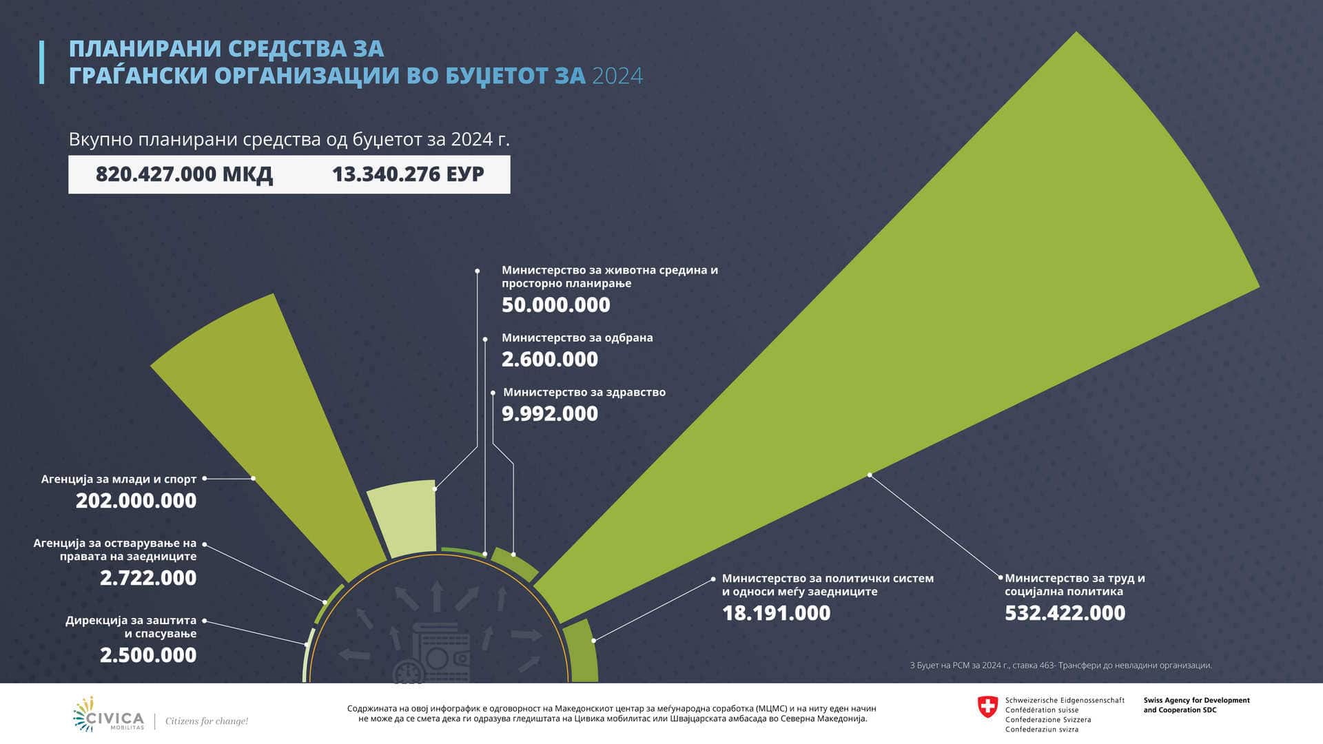 Во Буџетот на Република Северна Македонија за 2024 г. од ставката 463 – трансфери до невладини организации планирани се 820.427.000 денари или околу 13 милиони евра. Во овие средства не се земени предвид средствата кои се доделуваат од Министерството за правда бидејќи најчесто средствата од ставката 463 се доделуваат на политички партии и Министерството за култура бидејќи нема планирано срества од оваа ставка, таму средства за граѓански организации се доделуваат од буџетската ставка 464. Останува да видиме дали овие средства ќе претрпат промени со ребалансот на Буџетот кој наскоро го најави новиот премиер. Имено, со најавениот ребаланс на Буџетот очекуваме да нема намалување на веќе планираните средства кои во 2024 г. се помалку од тие кои беа планирани претходната година. Уште повеќе, очекуваме новата Влада да се посвети и да ги донесе предлог измените во Законот за здруженија и фонадации кои ќе бидат консултирани со засегнатите страни и кои ќе допринесат за позитивни промени во граѓанското општество.