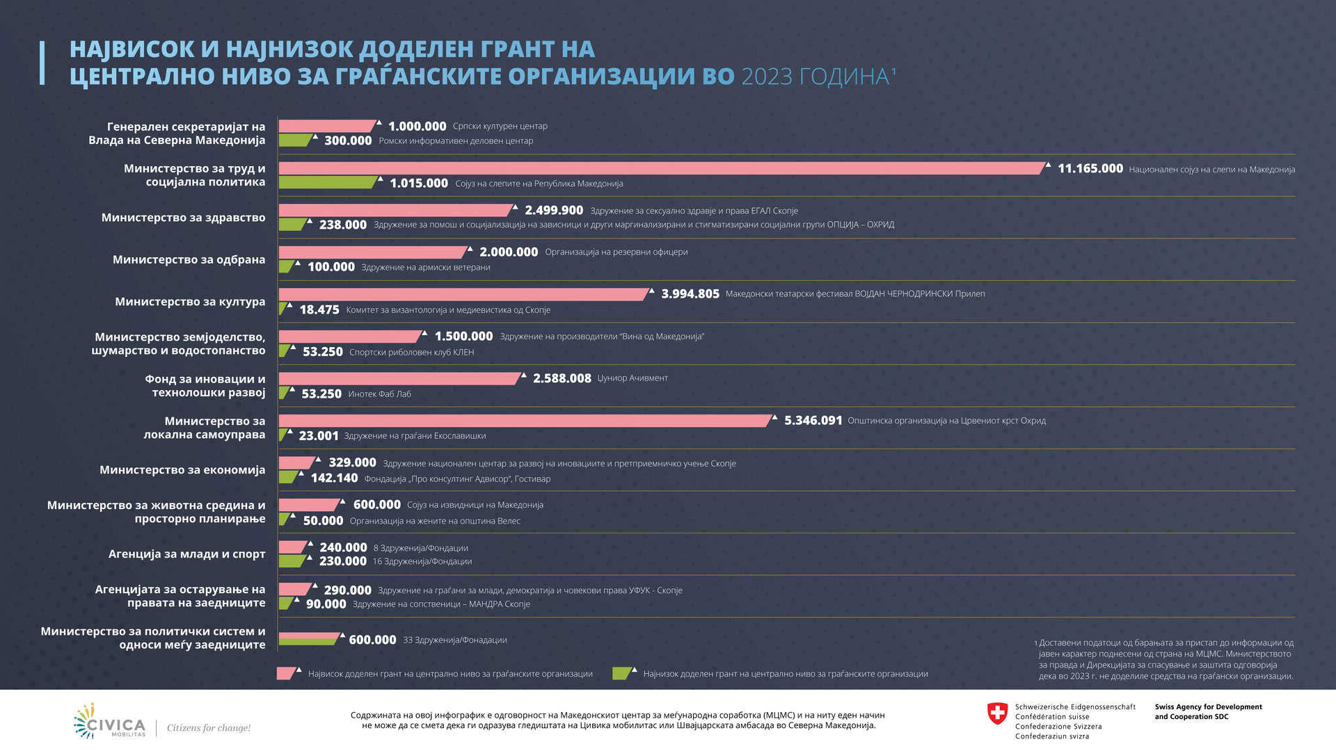 Во 2023 г. најнизок доделен грант за граѓанска организација од централниот буџет изнесува 18.475 денари и го доделило Министерството за култура за Комитетот за византологија и медиевистика. Додека, највисокиот доделен грант изнесува 11.165.000 денари и го доделило Министерството за труд и социјална политика на Националниот сојуз на слепи.