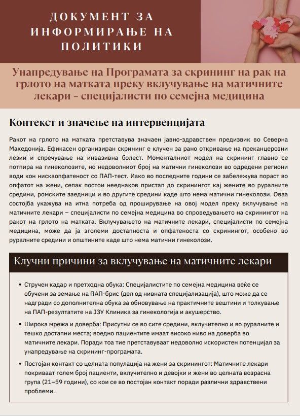 Документ за информирање на политики – Унапредување на Програмата за скрининг на рак на грлото на матката преку вклучување на матичните лекари – специјалисти по семејна медицина