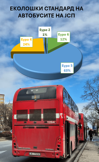 - Само 10 % од автобусите имаат највисок еколошки стандард Еуро 6, додека сите други се со еколошки стандард Еуро 4 и Еуро 5