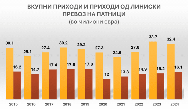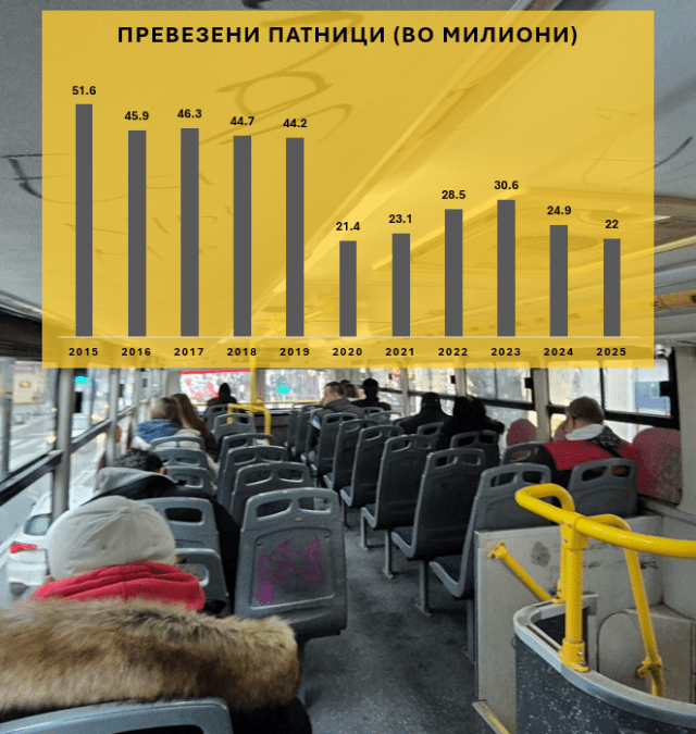 - Само за десет години, бројот на превезени патници со автобусите на ЈСП Скопје е намален за 30 милиони годишно – во 2015 се возеле 52 милиони патници, сега само 22 милиони годишно