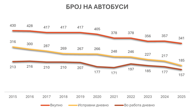 - Од вкупно 341 автобус, дневно исправни се 185, а во работа се пуштаат само по 157 автобуси дневно